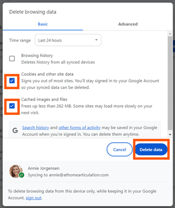 In the popup, make sure Cookies and other site data and Cached images and files are both selected. Then, click Delete data.